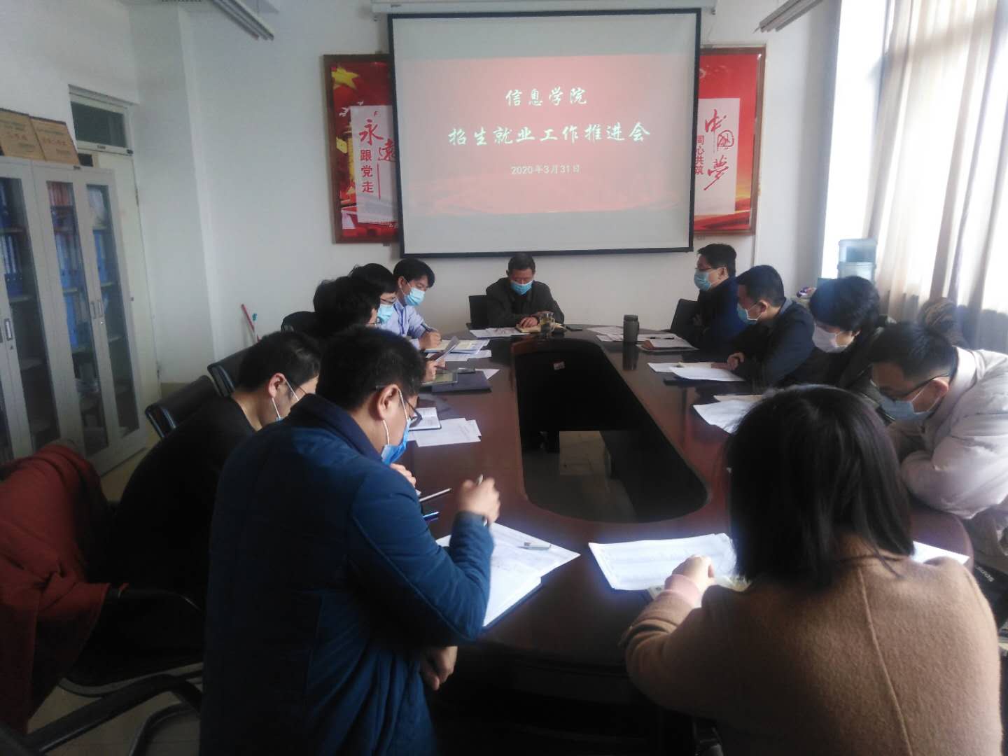 3月31日,信息学院在文理大楼1202会议室召开招生就业工作推进会,学院领导班子、系主任、专业主任、团委老师参加会议。会议由院长李西灿主持。