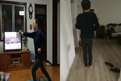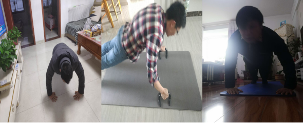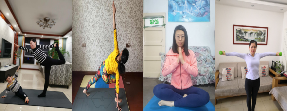 学院全体教职工参与此次抗疫健身活动, 72人上交作品数量百余份。体育锻炼方面,主要以单人或家庭的体育类健身活动为主,有的老师利用家中的跑步机、哑铃、呼啦圈、跳绳和毽球等体育器械开展锻炼(图1)、有的老师也会采取俯卧撑、仰卧起坐等无器械运动方式(图2),还有一部分老师跟随着视频开展健身操、瑜伽等健身活动(图3),老年教师则多以太极拳、健步走等运动开展健身活动(图4)。
