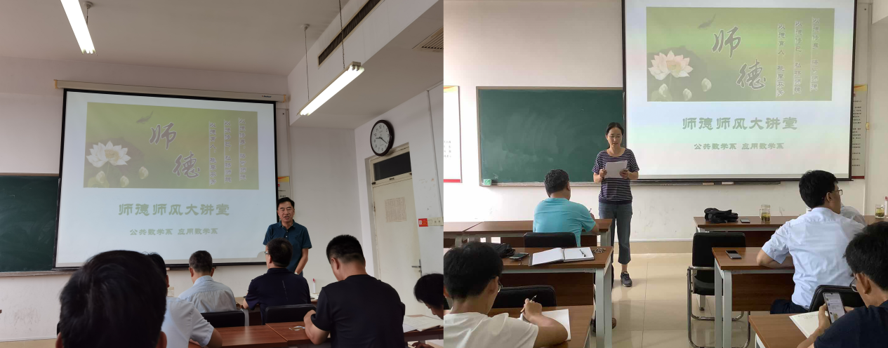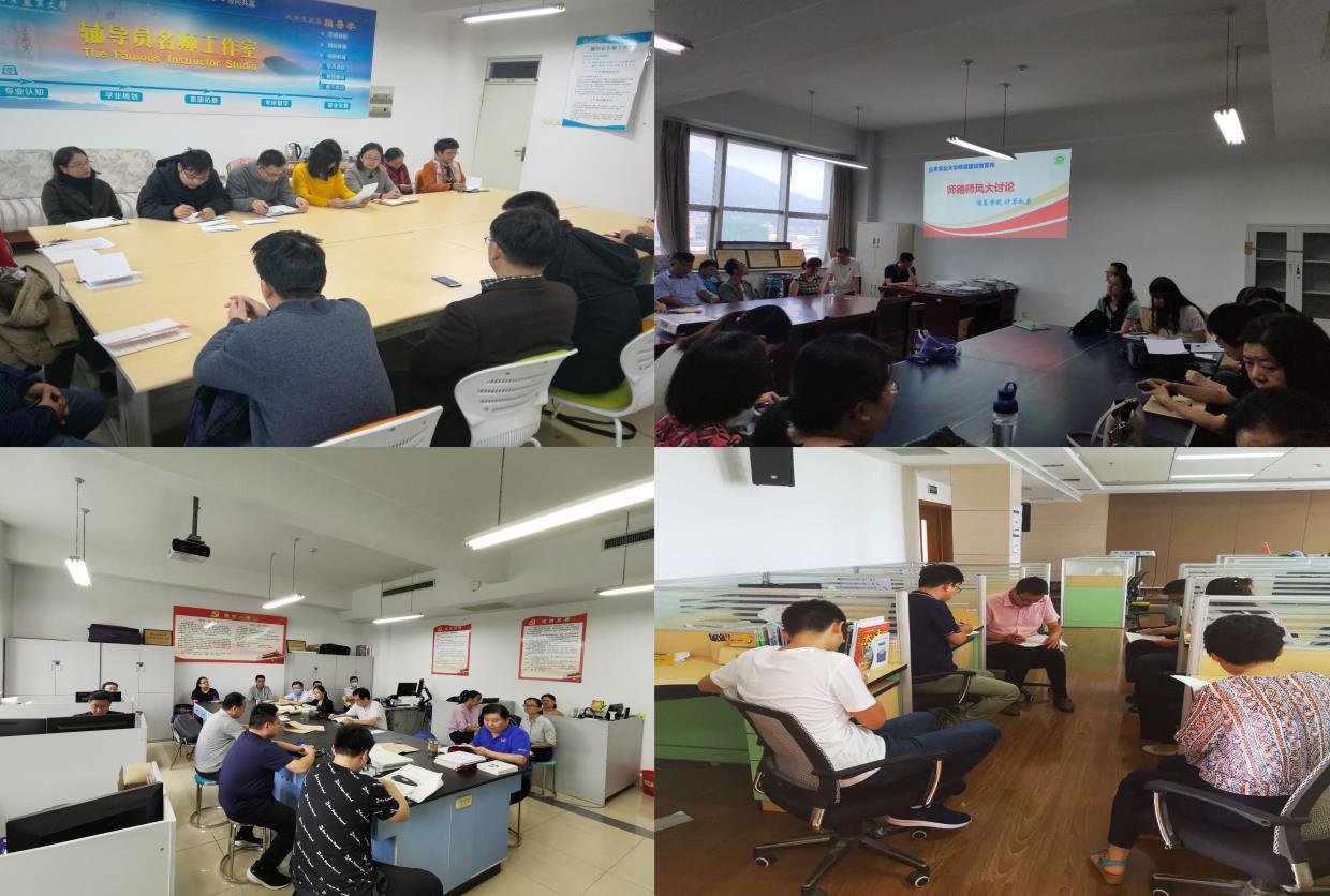 一是开设一场师德师风学习讲堂。各小组分别在线上和线下组织全体教师重点学习《关于加强和改进新时代师德师风建设的意见》、《高等学校预防与处理学术不端行为办法》、《科学技术活动违规行为处理暂行规定》和《山东省教育厅关于加强师德师风建设的意见》等文件精神,以及习近平总书记给郑州圆方集团职工的回信精神和给袁隆平、钟南山、叶培建等25 位科技工作者代表的回信精神。此外,各小组还积极邀请学院领导和专家给做师德师风报告,例如公共数学和应用数学两个小组邀请了王云诚教授为大家做了关于师德师风的报告,部分青年教师在听取报告后积极发言,谈体会、谈心得(图1)。