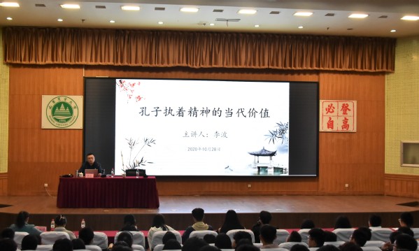 此次讲座以《孔子执着精神的当代价值》为主题。讲座伊始,李波院长以幽默风趣的语言、丰富的图文资料为载体,从时代背景、孔子生平事迹、诸子百家思想等方面导入,使学生对儒家文化的产生、发展和传播有了更为全面的认识。紧接着,李波院长基于儒家的经典著作和孔子及其弟子之间的故事,从坚守理想主义、应对社会现实、内在思想基础等三个方面向同学们展示了孔子的入世思想和执著精神。他强调,中华传统文化源远流长、博大精深,是中华民族的精神支柱,以孔子为代表的儒家思想所蕴涵的入世情怀和执着精神,是新时代中国特色社会主义文化建设的宝贵资源,对当下社会风气的培养和国民品格的塑造发挥着重要作用。李波院长以其丰富的学识、深入浅出的讲解为与会学生带来了一场文化盛宴,赢得了阵阵掌声。讲座最后,李波院长指出,作为新时代大学生,我们应在学习中不断领悟儒家文化的深刻内涵,培养不畏艰苦的奋斗精神,努力成长为勇于承担民族复兴重任的可靠接班人。