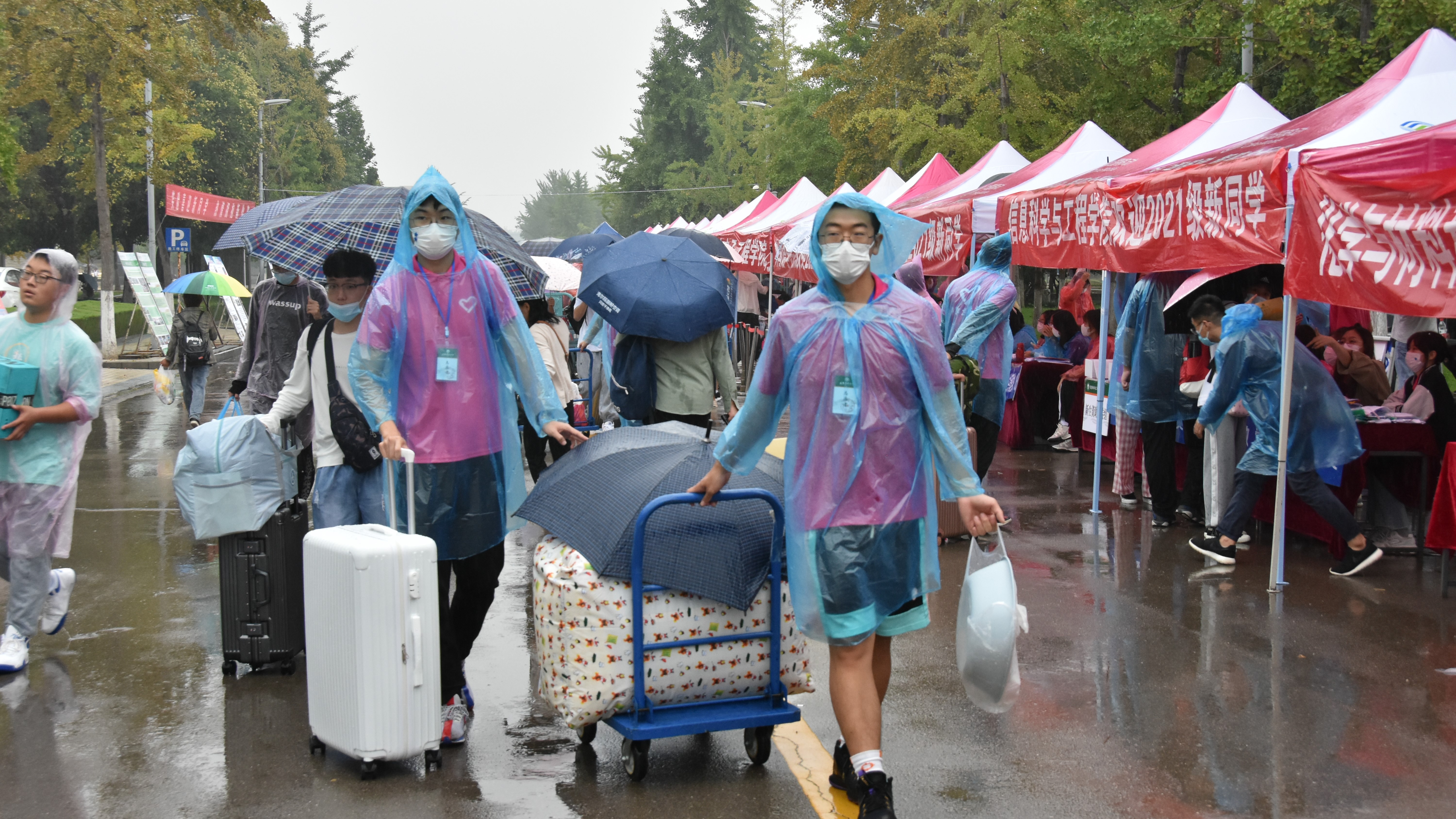 为应对恶劣天气对迎新工作带来的不利影响,为新生们提供更好的服务,学院组织已返校的2019、2020级学生组成迎新志愿服务队,80余名迎新志愿者穿着雨衣在校门口“点对点”对接每位新生,用热情的服务迎接着每一位新生的到来。