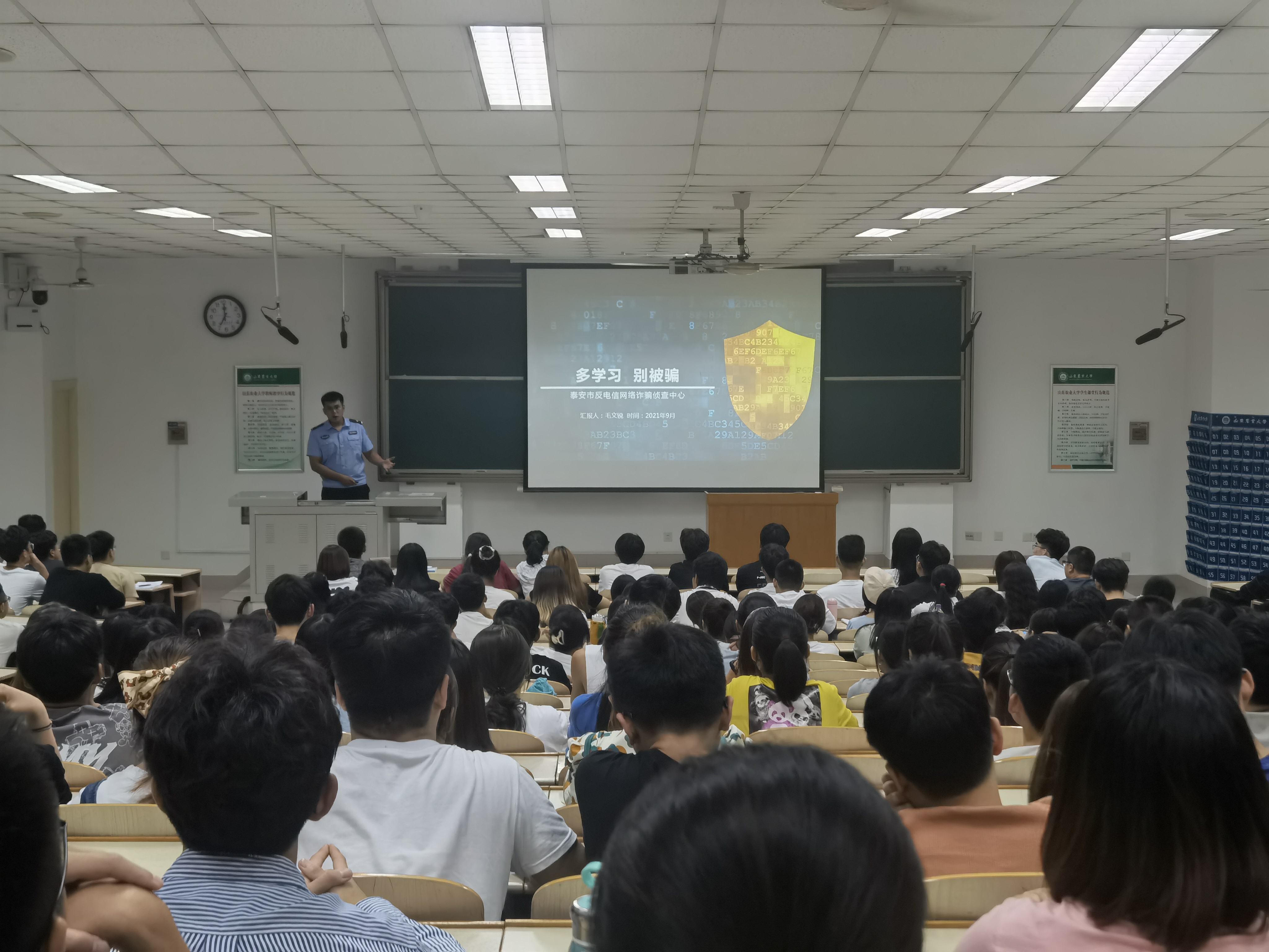 9月8日晚,信息学院在南校区综合楼N304举办安全教育报告会。邀请泰安市反电信网络诈骗侦查中心毛文锐警官担任主讲嘉宾,学院辅导员、2019级、2020级学生干部、学生会成员、2021级新生参加大会。