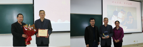 李西灿院长代表学院向李全忠教授颁发了荣休纪念牌并送上鲜花;公共数学系送上退休纪念品。