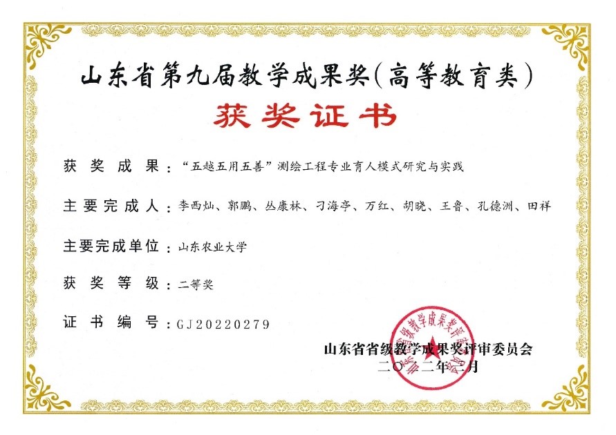 近日,山东省教育厅公布了第九届山东省高等教育省级教学成果奖获奖名单,学院李西灿教授主持的“五越五用五善”测绘工程专业育人模式研究与实践”荣获二等奖,实现学院省级教学成果奖新突破。