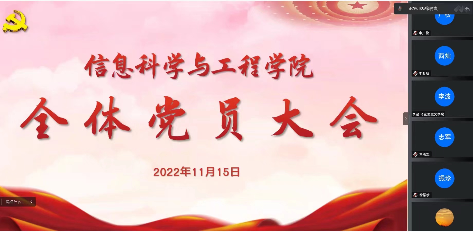 李波院长最后强调,作为一名共产党员,我们要认真学习宣传贯彻党的二十大精神,自觉运用习近平新时代中国特色社会主义思想武装头脑、指导实践、推动工作;同时作为高校教育工作者,要坚持“立德树人”根本任务,坚守“为党育人,为国育才”的使命担当,使大会提出的目标任务落地见效。