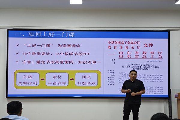 分享会上,第七届全国高校青年教师教学竞赛理科组三等奖获得者田大东老师、第六届全国高校混合式教学设计创新大赛一等奖获得者丛康林老师、山东省第十二届高校青年教师教学比赛二等奖获得者柳畅老师通过场景重现、主题分享等方式,以新颖的教学方式、清晰的逻辑框架和贴近生活的教学案例,现场示范了兼具学术性与趣味性的高效模拟课堂。在此期间,三位获奖教师与大家分享了各自在讲课比赛中的参赛经验,并结合自身参赛经历,详细剖析了如何优化教案设计、提升课堂表现力、科学应对比赛压力等问题。