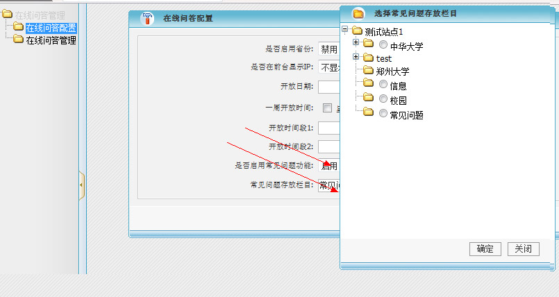 1,栏目管理里建一个栏目名为"常见问题" 2,点击"组建管理/在线问答管理",点击"在线问答配置",将"是否启用常见问题功能"设置为"启用",并设置常见问题存放栏目: