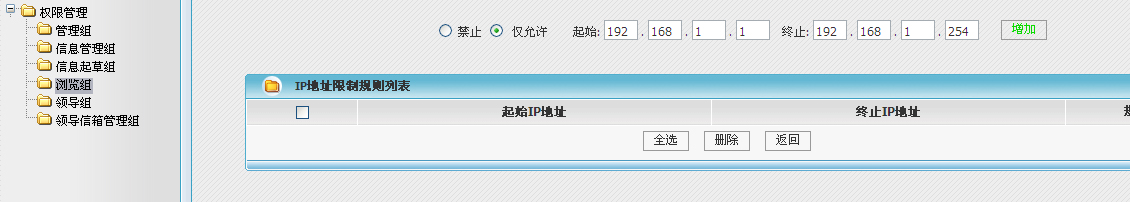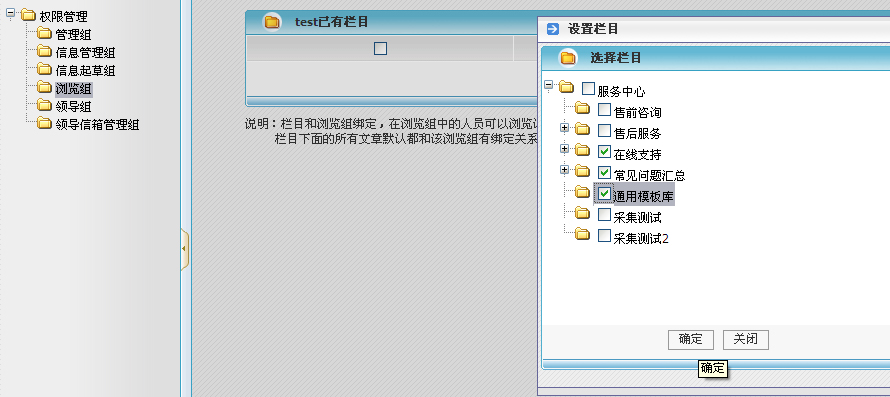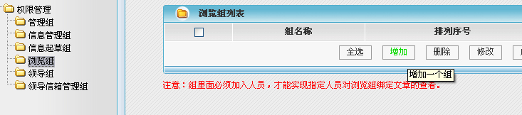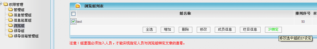 该栏目被加到组里后,默认所有文章都是收限制的文章,如果需要某一篇文章公开,需要在信息管理里,将文章的浏览权限修改过来