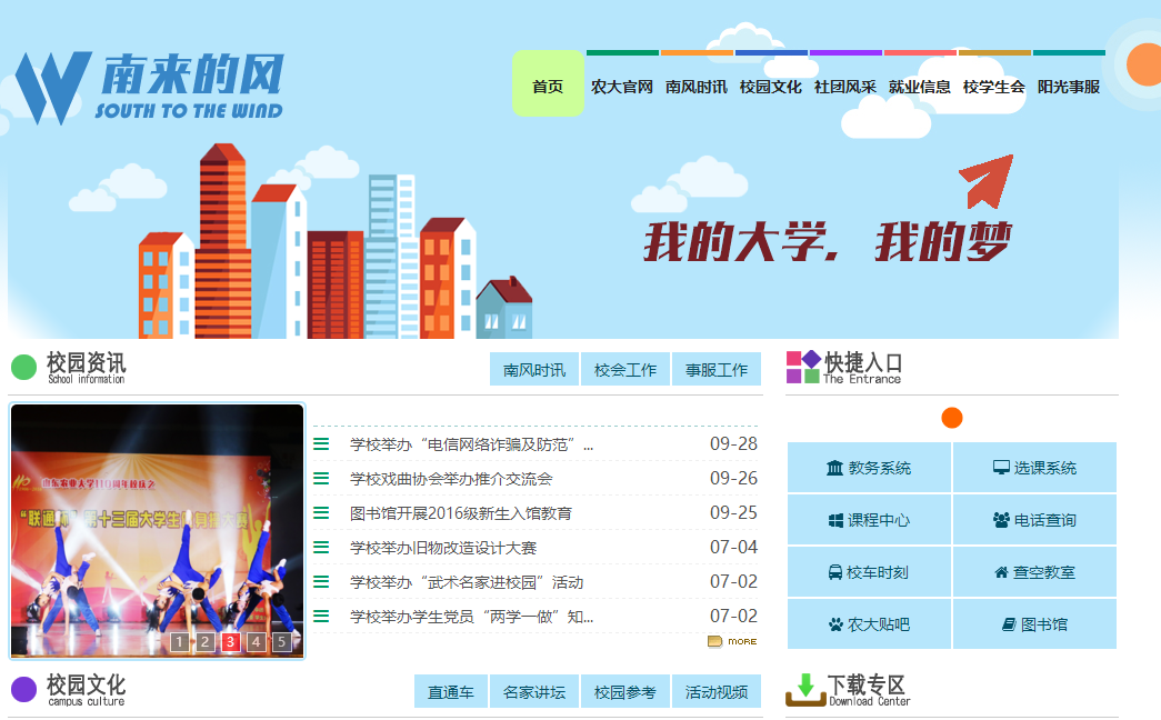 南来的风网站是山东农业大学南校区学生示范性网站,隶属于南校区学生管理部,由大学生事务服务中心设计并维护;致力于建设优质的学生网站,展现当代大学生风采,开启互联网时代的新风貌.