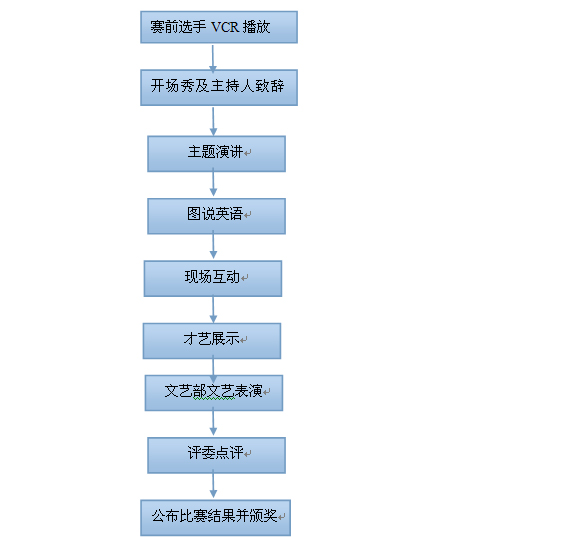 才艺展示:将9名选手分为3组,为保证公平公正,分组方式由选手抽签产生,才艺展示要求为全英文形式,表现形式(歌曲、情景剧或电影配音等)由选手自定。专家组对每组三人进行单独评分。本环节要求每组比赛时间为5min完成。