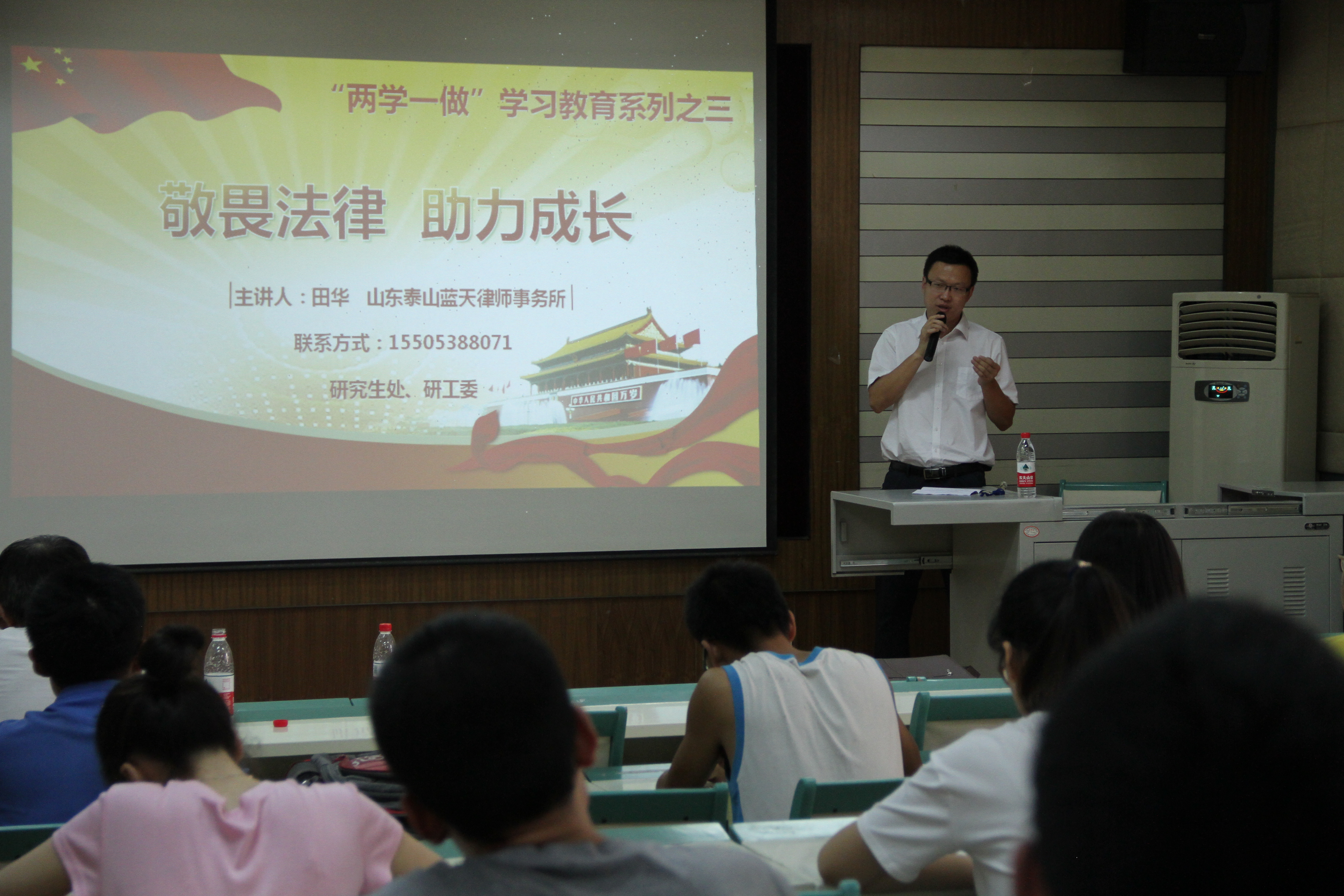 为扎实推进 “两学一做”学习教育工作,研究生处、研工委特别邀请了山东泰山蓝天律师事务所的田华律师为研究生上“讲规矩有纪律”专题党课。
