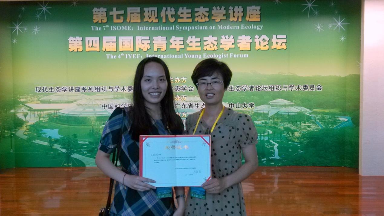 2013年 ISOMES 李博院士研究生论文奖共有 30 多人申请并墙报参展,主要由中华海外生态学者协会组成的评选委员会经过认真评选,共评选出 5位研究生为获奖者。土肥资源高效利用国家工程实验室研究人员焦树英博士指导的一年级草业科学专业硕士研究生王雅楣同学以评分第一名的成绩获此殊荣。她的获奖论文的题目是:Comparison of dicyandiamide (DCD), thiourea(TH) and controlled-release nitrogen fertilizer(CRNF) for retardation of nitrification of urea N in soil。