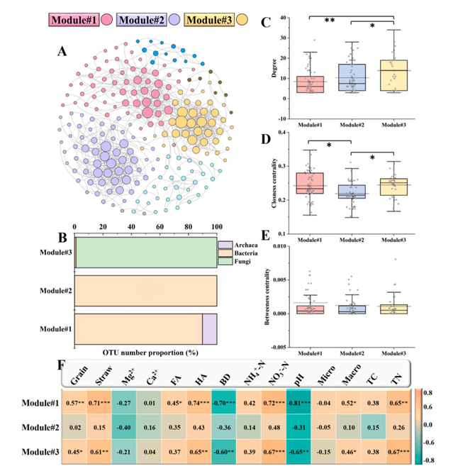 共现网络被用来识别密切相关的细菌、真菌和古细菌群落在共现网络中,三个共生模块(Module#1、Module #2、Module #3)表现出强烈的共现现象(图4)。Module#1有64个节点和180条边,Module #2有62个节点和255条边,Module #3有38个节点和195条边。我们对Module #1、#2和#3进行了单独的网络分析,发现Module #1和#3的亲近中心性显著高于模块#2。另一方面,Module #3的度等级明显高于Module #1和Module #2。Module #1和Module #3也被发现与小麦产量以及土壤化学和物理性质显著相关。Module #1的相关性最高,其次是Module #3。因此,我们认定Module #1和Module #3是关键的共生模块,因为它们与小麦产量和土壤理化性质的相关性较高。