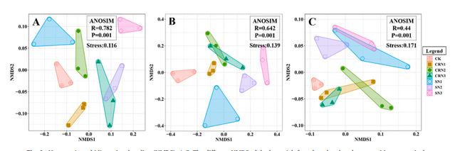 图1. 非度量多维测度 (NMDS)。 A-C:细菌、真菌和古菌群落的不同NMDS。