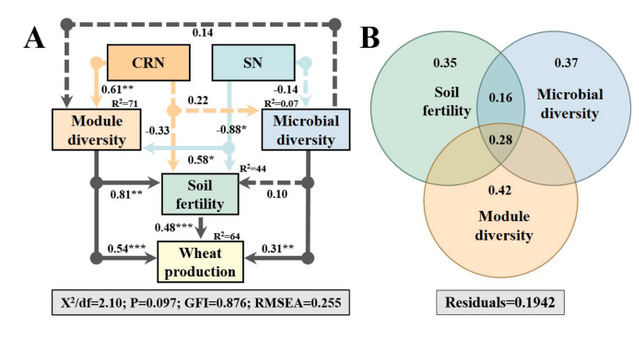 通过效应分析和VPA分析,我们发现微生物群落多样性、共生模块多样性、土壤肥力和小麦产量之间存在显著的直接正相关关系,模块多样性对作物产量的影响最大。另一方面,群落的丰度和土壤的肥力对作物生产的影响基本相同。因此,在小麦产量和肥力因子方面,CRN肥的长期施用效果优于SN肥。