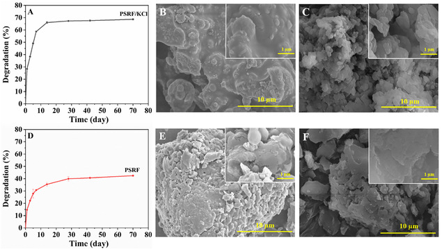 图3(A)PSRF/KCl和(D)PSRF在土壤中的降解速率,(B)PSRF/KCl,(E)PSRF在降解前(0天)和(C)PSRF/KCl,(F)PSRF在土壤中降解70天后的SEM图像