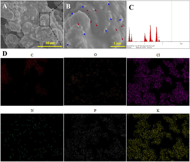 图2(A,B)PSRF/KCl的SEM图像和(C,D)相应的EDS分布图