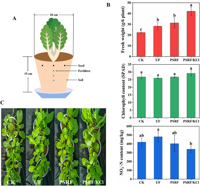 图4(A)盆栽实验示意图;(B)不同施肥处理小白菜鲜重、叶绿素含量、硝酸盐含量;(C)小白菜收获时期的数码照片