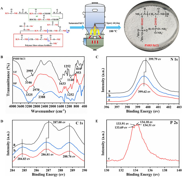 图1(A)PSRF/KCl的合成机理,(B)PSRF/KCl、UF和DP的FTIR光谱,(C)UF(a)、PSRF(b)和PSRF/KCl(c)的N 1s光谱,(D)UF(a)、PSRF(b)和PSRF/KCl(c)的C 1s光谱,(E)PSRF/KCl的P 2s光谱