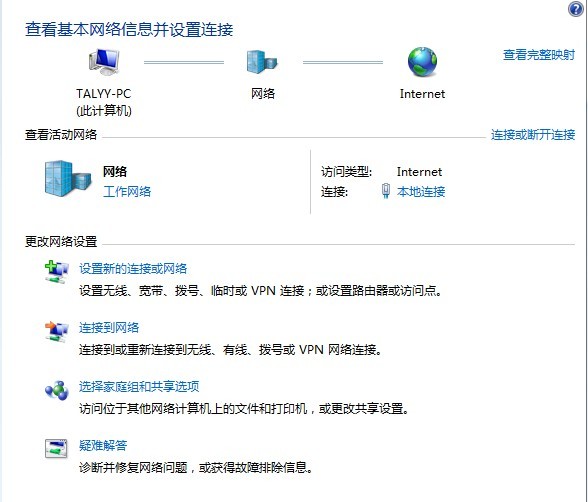 在显示屏右下角 日期过来两个 有一个像电脑的小标识 :Internet访问/网络 标识 单击它 会出现一个小面板 点击 “打开网络和共享中心” 点击“本地连接”