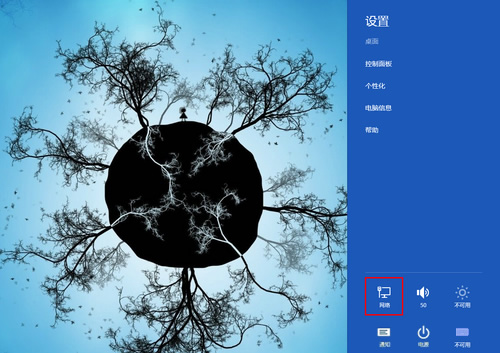 将鼠标滑到屏幕的右上角或是右下角,呼出Charm栏选择其中的“设置”,在下端的图标中我们可以看到排在第一个的“网络”图标。