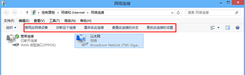 如果希望看到网络列表,可以通过左侧的“更改适配器设置”来进入,这里是就与XP和Win7一样的界面了。点击网络图标可以看到在工具栏上会出现“禁用”、“诊断”等按钮,作用与以前是一样的。