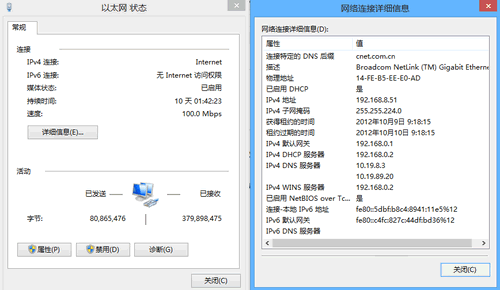 其中的“以太网”就是以前的“本地连接”,没有实质变化只是换了个名称。点击“以太网”我们可以像Win7一样查看网络状态,这里弹出的窗口与Win7无异,包含了“详细信息”和“属性”等常规选项。