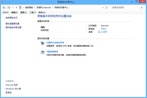 与Win7一样,Win8的网络设置还是全部集中在传统的设置页面中。进入传统网络设置有两个主要路径,一是通过控制面板进入,还有一个是右击任务栏中的网络图标,选择“打开网络和共享中心”来进入。