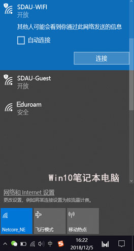 笔记本、平板设备打开电脑任务栏无线图标,找到SSIDSDAU-WIFI的无线信号以后点击连接。手机的连接方式为“设置”—“WLAN”,搜索SSIDSDAU-WIFI的无线信号,选择连接。