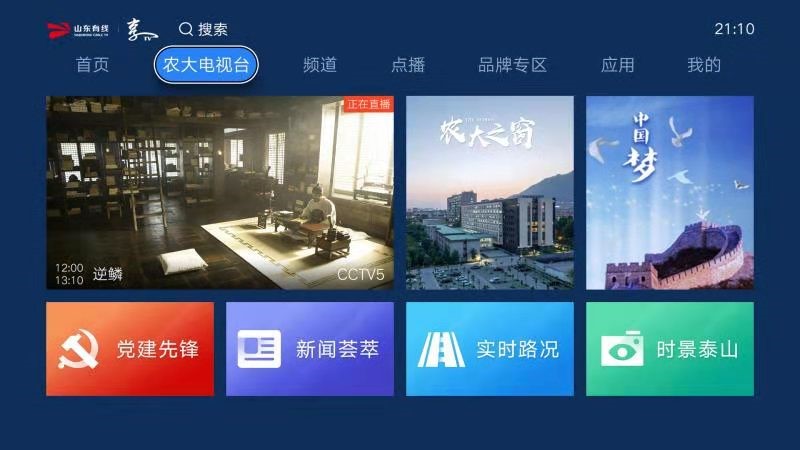 开启电视,自动进入“智慧农大”定制界面,默认页面为首页正常直播频道,点击遥控器“方向键”可自由选择进入农大电视台。
