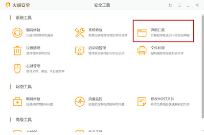 3、进入到软件界面后会看到四个不同选择的功能菜单,点击“安全工具”可以根据个人需求使用。关闭自动弹广告,在“安全工具”的系统工具,点击弹窗拦截,选择想要拦截的软件就可以(默认全部拦截)。如图所示: