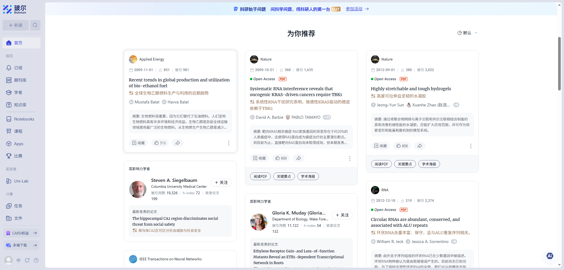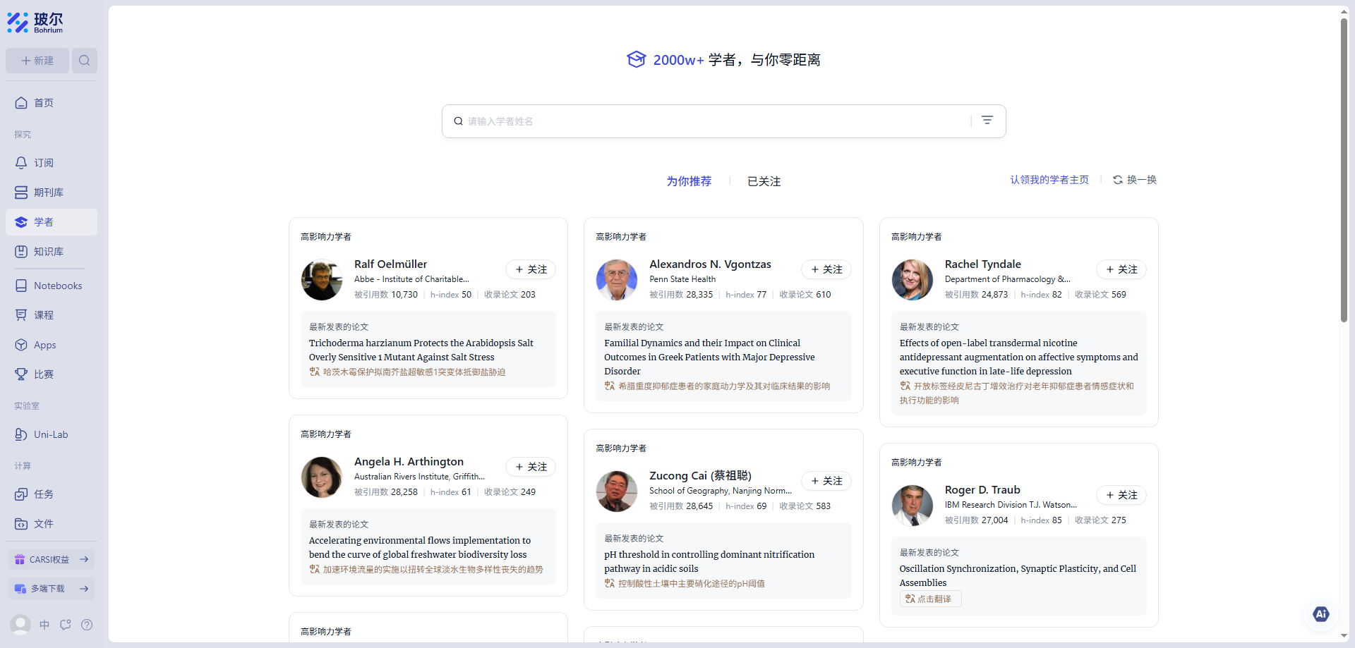 科学导航平台收录超2,000w+全球活跃学者,全面覆盖科研画像、研究方向、学术成果与合作网络,一站式了解“谁在研究什么”。