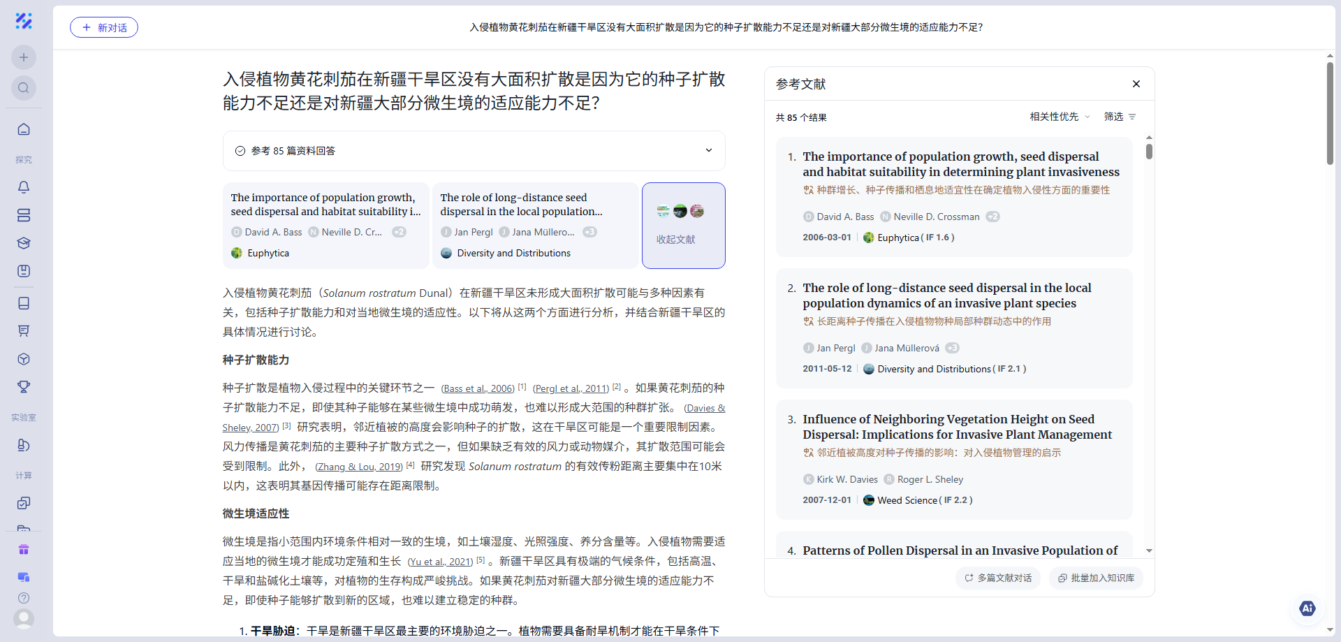①输入或选择的科学问题,科学导航将自动解析问题意图,匹配最相关的科研成果,并智能生成精准答案。可一键跳转至原始文献,获取更深入的研究信息,确保科研探索的全面性与可溯源性。