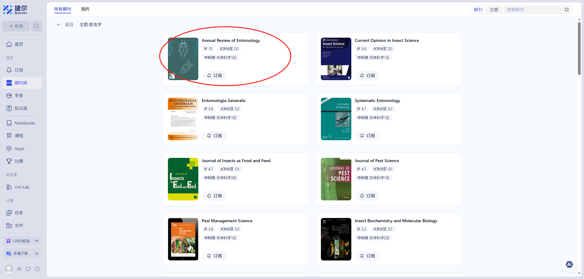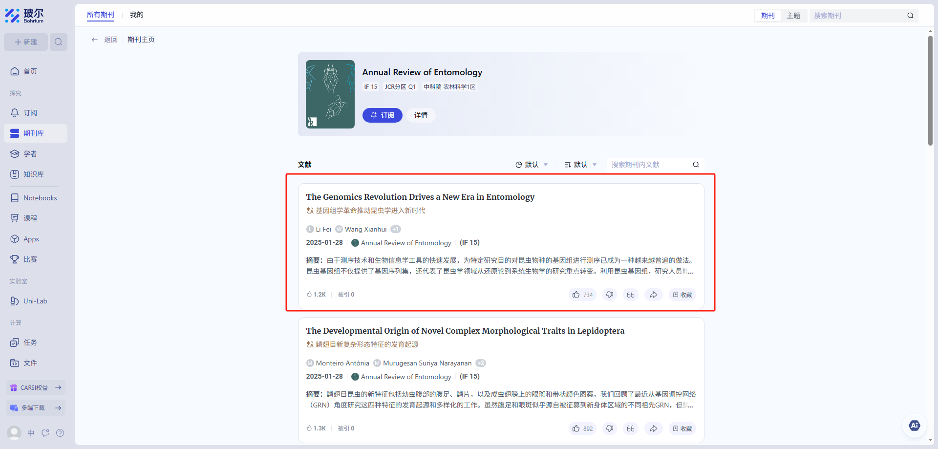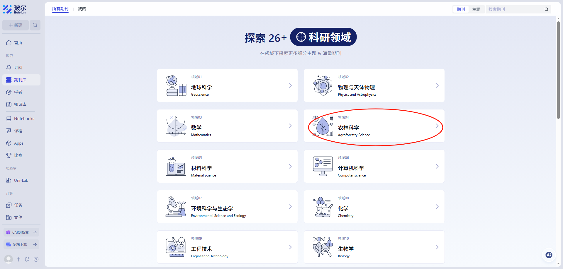 ②左侧期刊库可查询感兴趣的科研领域,循序点击可查看最新科研论文。