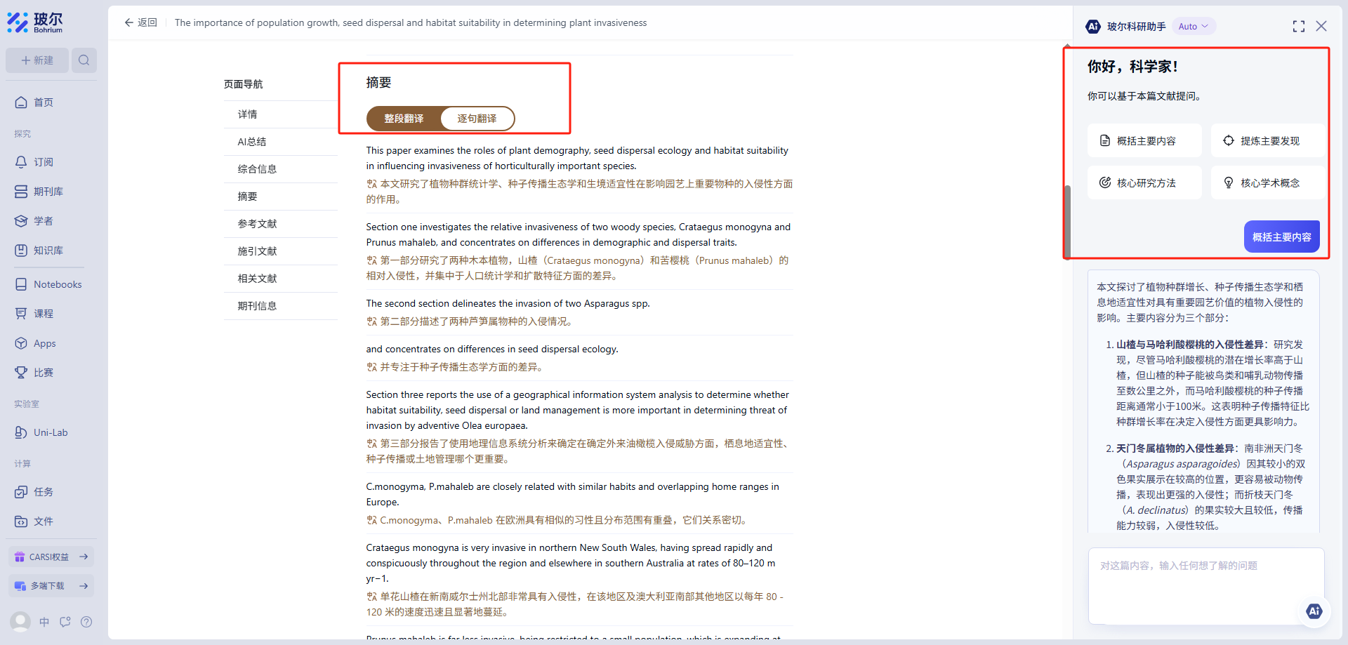 ②文献详情页面支持文献翻译,右侧边栏支持“AI分析总结”