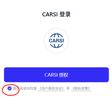 4.阅读《用户服务协议》和《隐私政策》后勾选“同意”并点击CARSI授权