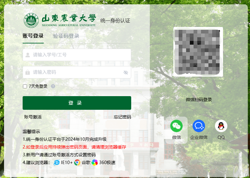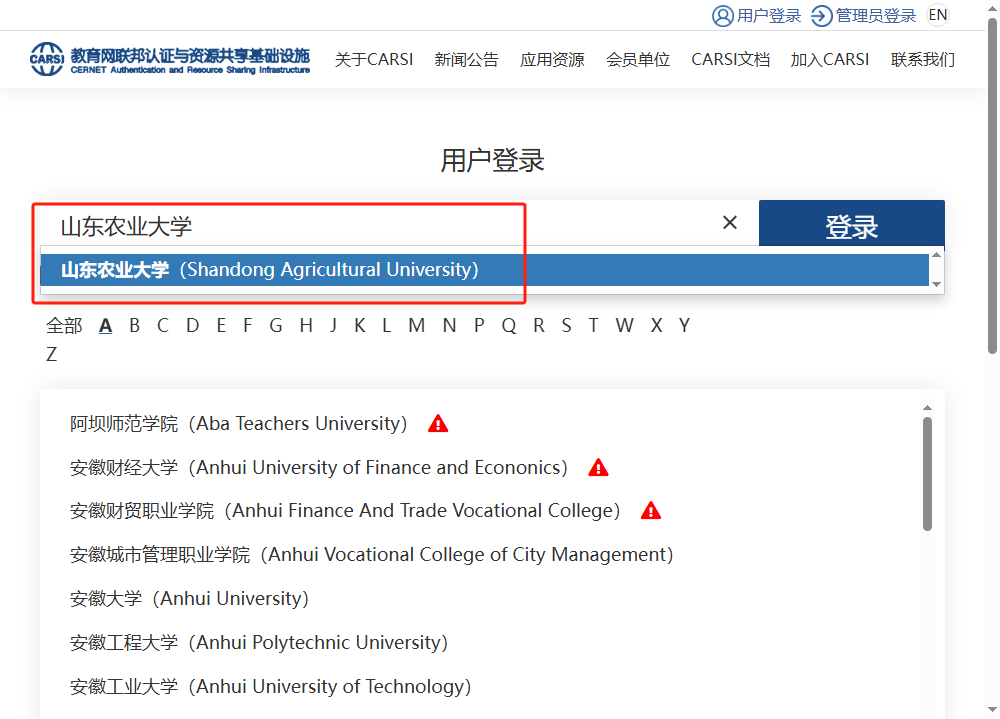 5.于输入框中输入“山东农业大学”点击登录进入统一身份认证界面。