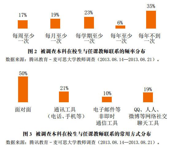 虽然学生几乎每周都会和任课教师在课堂上见面,但他们课堂之外的联系却不多。腾讯-麦可思调查显示,被调查的本科生中,36%与任课教师每个月都有联系,但同时有35%的本科生与任课教师每年联系不到一次。