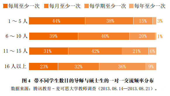 腾讯-麦可思调查显示,被调查的硕士生,其导师带的学生越少,师生之间的交流越频繁。具体来看,带1~5个学生的导师,44%每周至少与学生一对一交流一次,高于带16个以上学生导师的该比例21个百分点。硕士生培养需要导师有针对性的辅导。从此数据可以看出,导师招收学生确实需要量力而行。