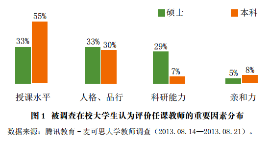 腾讯-麦可思调查显示,从2013年8月14日至21日,被调查的大学生在评价任课教师时,最看重教师的“授课水平”。具体来看,55%的本科生认为教师“授课水平”最重要;硕士生的这一比例为33%,且有29%的硕士生认为“科研能力”最重要。可见,在学生看来,老师“课好”才是硬道理。