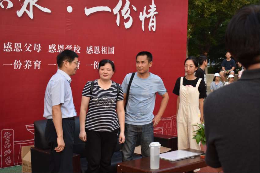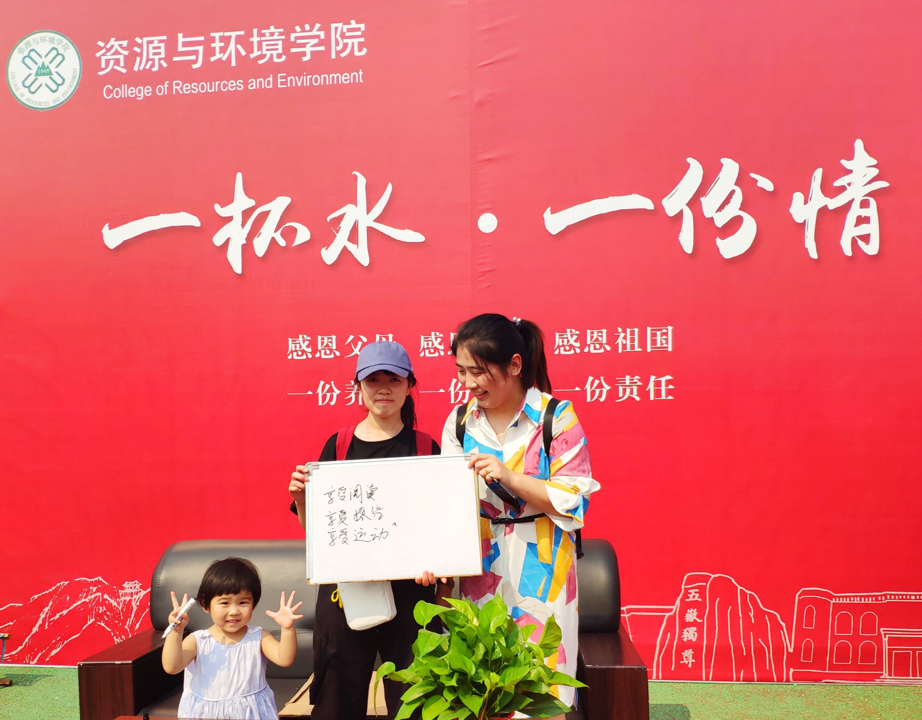 家校合作,感恩教育。在学院设置的家长休息区,由学院领导、专家教授组成的迎新小组为家长答疑解惑,向家长介绍学校、学院概况,旨在帮助新生家长具体了解资环学院师资配备、专业发展前景等重要信息,打消家长顾虑,建立“家校合作教育,共促学生发展”家校合作培养模式。另外,“小举凝情,大爱托冀”,学院特策划“一杯水,一份情”活动,家长看到孩子在大庭广众下为自己写下深情款款的话语、敬上亲情满满的一杯水,喜悦之情溢于言表。